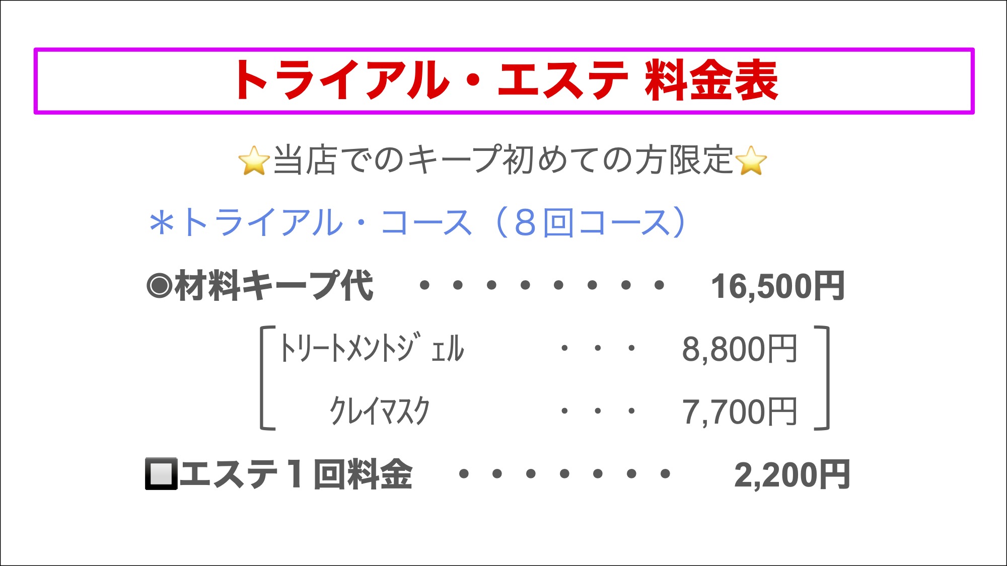 | 営業時間 | 9時30分~19時30分【エステ受付時間18時30分迄】 |
